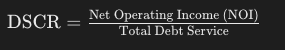 DSCR=Net Operating Income (NOI)Total Debt Service\text{DSCR} = \frac{\text{Net Operating Income (NOI)}}{\text{Total Debt Service}}DSCR=Total Debt ServiceNet Operating Income (NOI)